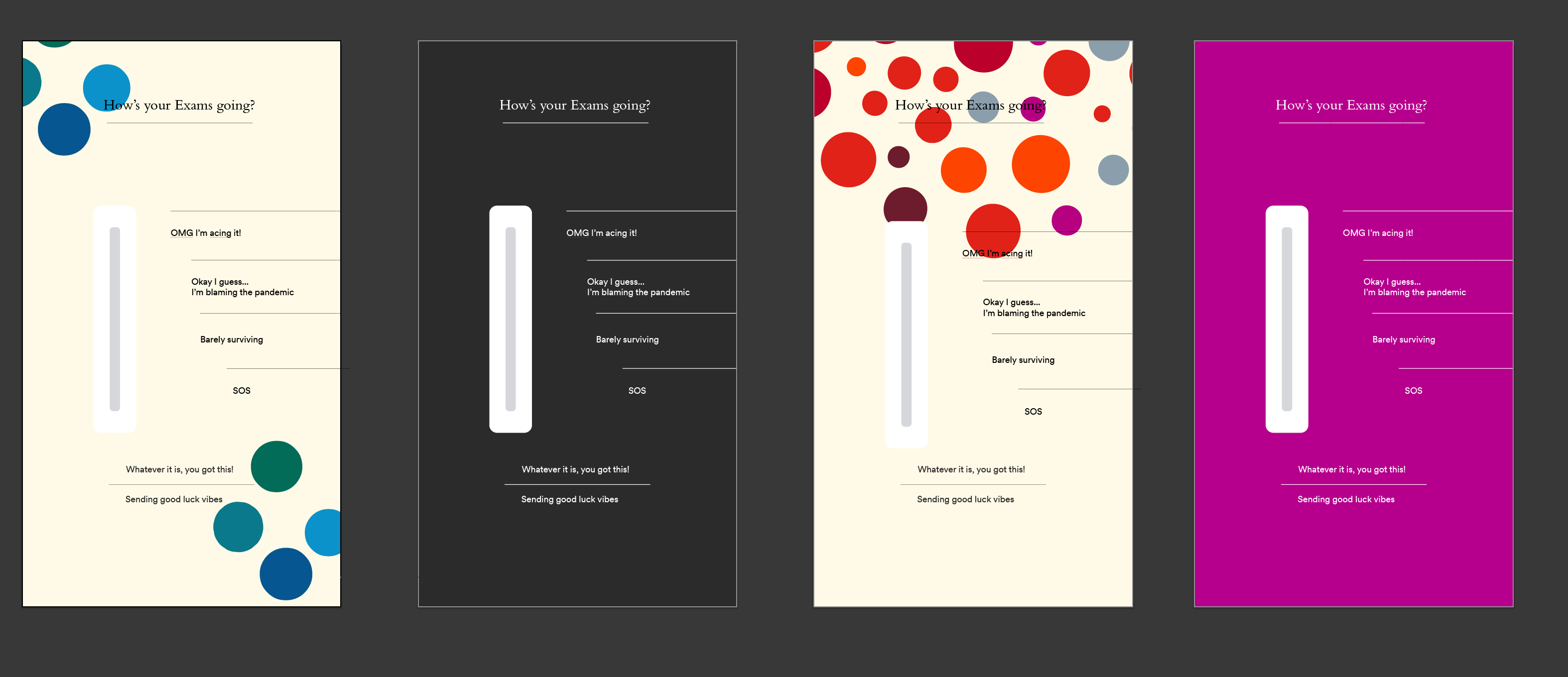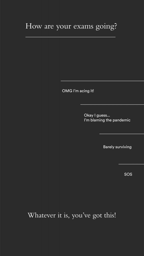 Different variations of the same copy on different graphics. The idea was to use Instagram’s slider in the stories to encourage student engagement and rate how they were feeling about their exams.