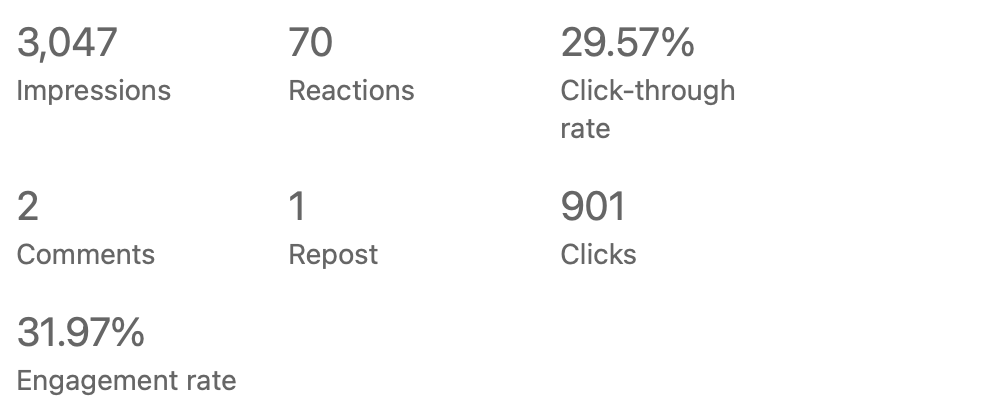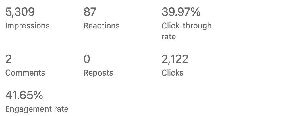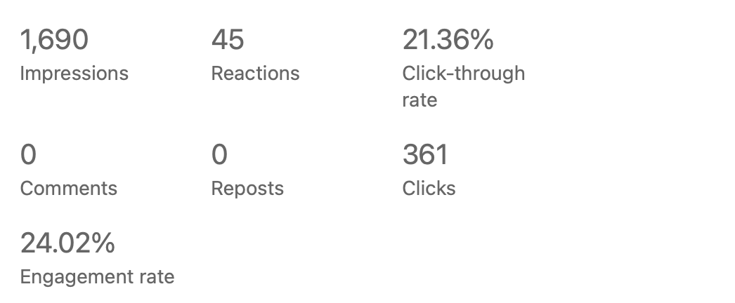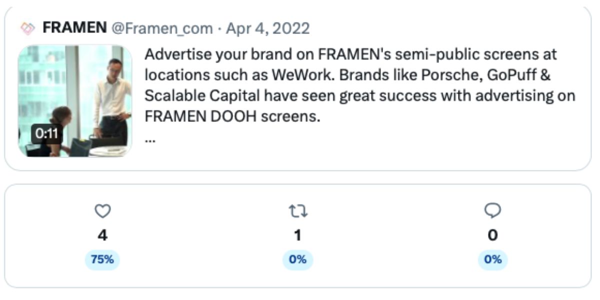 As a Creative Copywriter & Senior Editor, I create the copy for social media posts and monitor the performance to check what performed well, how many impressions the content received, click-through and open rate, also A/B testing. Here are some examples of the performance results I achieved for posts I wrote for Axel Springer – FRAMEN, a B2B SaaS platform.